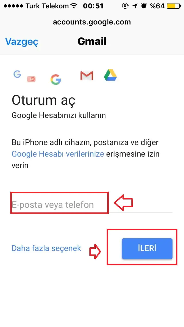 Google E- posta adresinizi (Gmail) girdikten sonra E-posta adresinize ait şifrenizi yazıp, İleri butonuna tıkladıktan sonra Gmail hesabınız iPhone cihazınıza eklenmiş olacak.