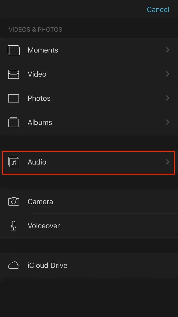 • iMovie‘nin müzik kütüphanesi yerine, beğendiğiniz başka şarkıları eklemek için; proje düzenleme sayfasında, videonun solundaki ve altındaki + (artı) simgesine dokunun.