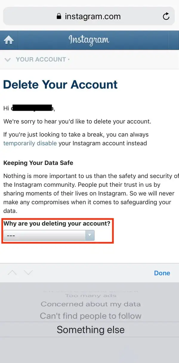 • Giriş yaptıktan sonra, bir açılır menü aracılığıyla Instagram hesabınızı neden silmek istediğinizi yanıtlamanız istenecek.