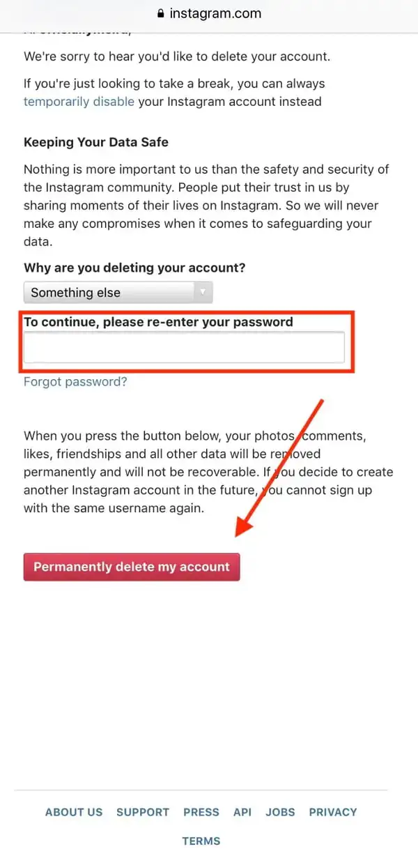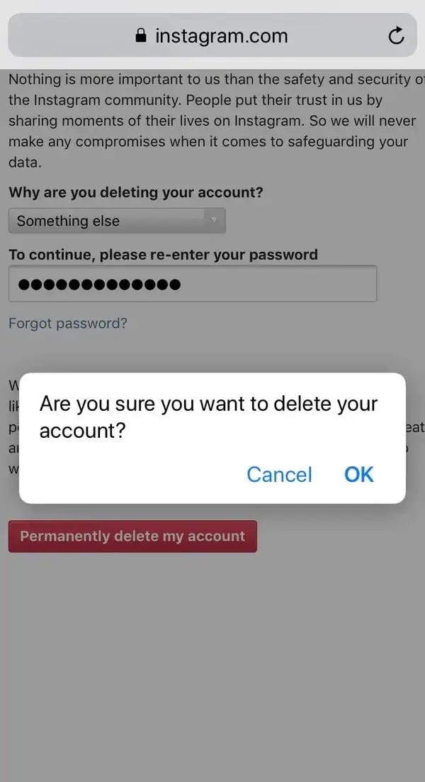 • Daha sonra şifrenizi tekrar girmeniz istenecek. Şifrenizi girdikten sonra, alttaki Hesabımı kalıcı olarak sil (Permanently delete my account) seçeneğine dokunun.