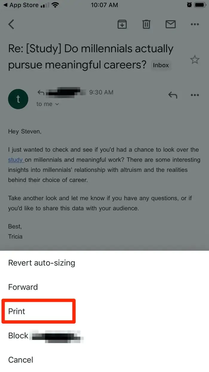 • Gmail uygulamasında, yazdırmak istediğiniz e-postayı bulun ve açın.