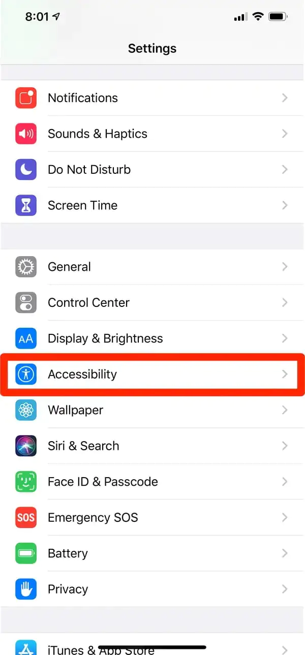 • iOS 13 veya üzeri bir iOS sürümü bulunan iPhone‘da Erişilebilirlik (Accessibility)  seçeneğine dokunun. iOS 12 veya daha eski bir iOS sürümü bulunan iPhone‘da ise önce Genel (General) seçeneğine ve ardından Erişilebilirlik (Accessibility) seçeneğine dokunun.