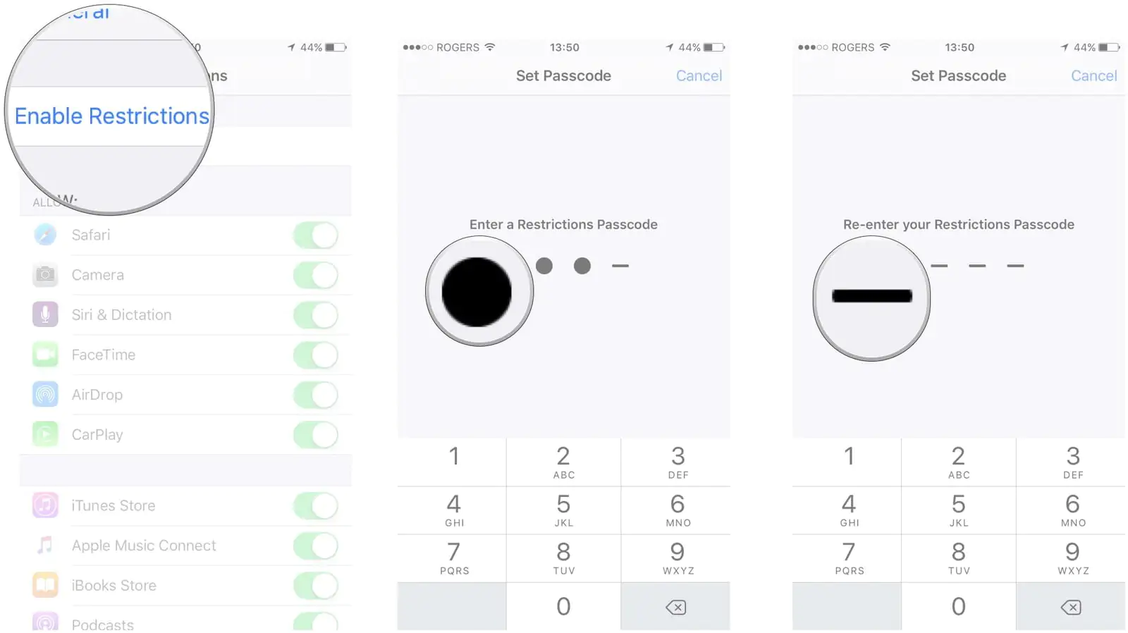 - Daha önce etkinleştirmediyseniz, Kısıtlamalar (Restrictions)’ı etkinleştirmek için ekranın üst kısmında yer alan ‘Kısıtlamaları Etkinleştir (Enable Restrictions)’ seçeneğine dokunun. Etkinleştirdiyseniz adıma geçin.