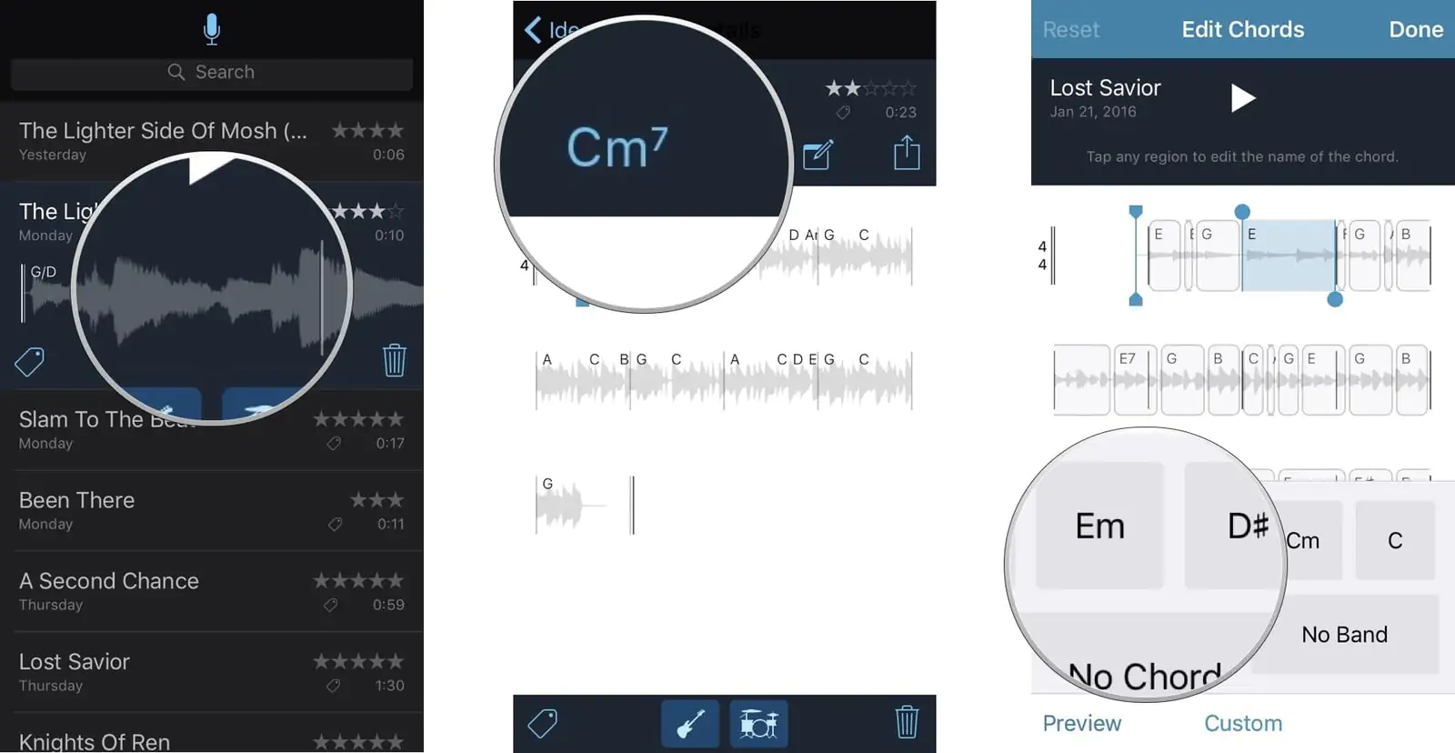Akordlar, şarkı sözü parçanızda (kaydınızda) ‘Müzik Notları (Music Memos)’ uygulamasının uygun akordun olması gerektiğini belirtiği bölümlerde (E, Gm, D #, vb.) etiketleri ile gösterilir.