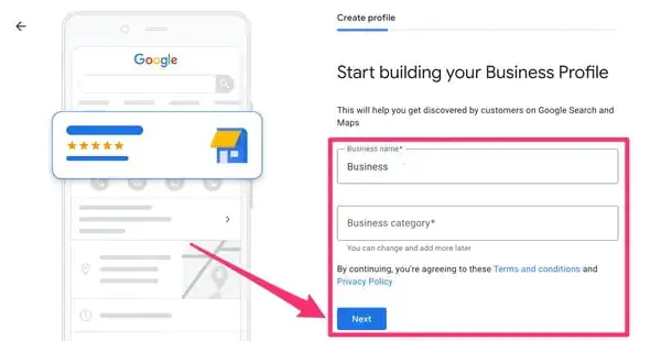 • Sonraki sayfada İşletmenizin adını ve kategorisini (restoran, perakende, kuaför vb.) girin. Ardından, İleri (Next) butonuna tıklayın. Daha sonra ek kategoriler ekleyebilirsiniz.