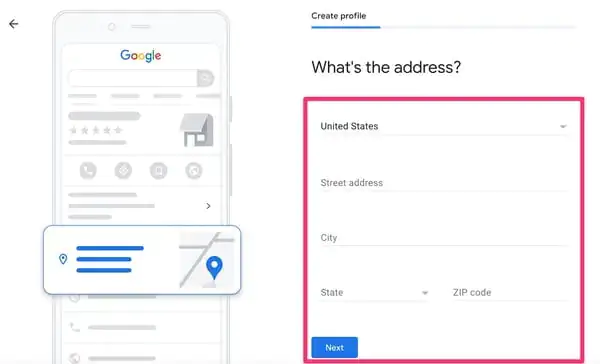 • İşletmenizi Google Haritalar‘a eklemeyi seçtiyseniz, sonraki ekranda işletme adresinizi girmeniz istenecektir. Konumunuzu gizli tutmayı seçtiyseniz, bir sonraki ekranda hizmet alan(lar)ınızı girmeniz istenecek. İlgili bilgileri doldurun ve İleri (Next) butonuna tıklayın.