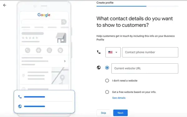 Not: Henüz bir web siteniz yoksa, Google‘ın sizin için otomatik olarak bir web sitesi oluşturması için Bilgilerinize göre ücretsiz bir web sitesi edinin (Get a free website based on your info) seçeneğini seçebilirsiniz.