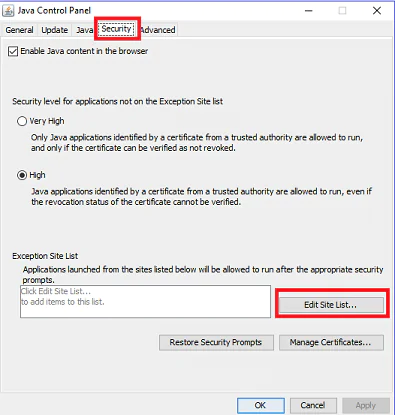 • Bir sonraki adımda ise, aşağıdaki ekran görüntüsünde görüldüğü gibi ‘Java’ penceresi açılıyor; ‘Security’ sekmesine tıklayalım.