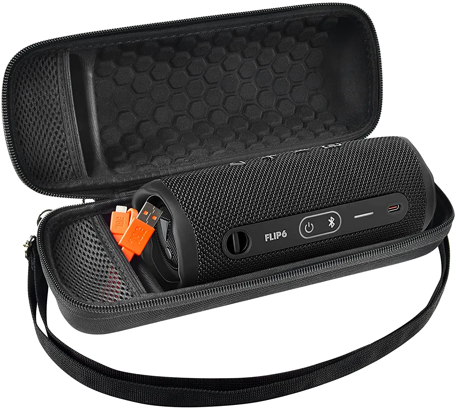 Flip 6, IPX7 derecesini Flip 5’ten tam bir IP67’ye yükseltir, bu da artık suya ve toza dayanıklı olduğu anlamına gelir. Hoparlör, sahilde tuzlu suya dalmaktan kurtuluyor. Aynı zamanda kum ızgaranın veya bas sürücülerin arkasına bile giremiyor. Plastik tamponlar, hoparlörün düz düşmek yerine biraz zıplamasını sağlar. Bu, ezikleri önlemek için iyidir. Ancak aynı zamanda bu alanların sürtünerek çizikleri ve izleri hızla toplaması anlamına gelir. Arkadan aydınlatmalı Bluetooth ve güç düğmelerinin yanına bağlı bir taşıma halkası var. Döngünün yerleşik bir klibi yoktur. Ancak, yıpranır veya kırılırsa, çözebilir ve kendiniz değiştirebilirsiniz. USB-C şarj bağlantı noktası da burada.