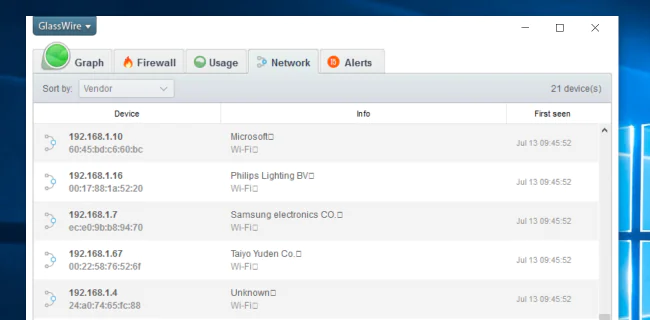 GlassWire güvenlik duvarı ve güvenlik sistemi yazılımı harika bir uygulamadır ve en harika özelliklerinden biri de, kablosuz ağınıza bağlanan tüm cihazları gösteren, kullanımı hızlı ve kolay bir Network (Ağ) seçeneği (menüsü) sunan bir Pro versiyonunun olması.