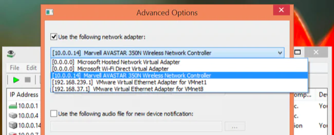 Bu yazılım, kablosuz ağ adaptörünüzü açıkça belirtinceye kadar düzgün çalışmayabilir. Windows bilgisayarda, Wireless Network Watcher Wireless Network Watcher uygulamasında sırasıyla Seçenekler (Options) ⟶ Gelişmiş (Advanced) menülerine tıklayıp, açılan pencerede ‘Aşağıdaki ağ adaptörünü kullan (Use the following network adapter)’ kutucuğunu işaretledikten sonra, açılır menüden kablosuz ağ adaptörünüzü seçip tarama yapabilirsiniz.