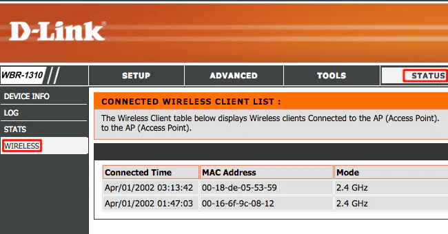 Birçok D-Link modelinde, kablosuz ağa bağlanan cihazların listesi Durum (Status) ⟶ Kablosuz (Wireless) menüsü altında bulunabilir.