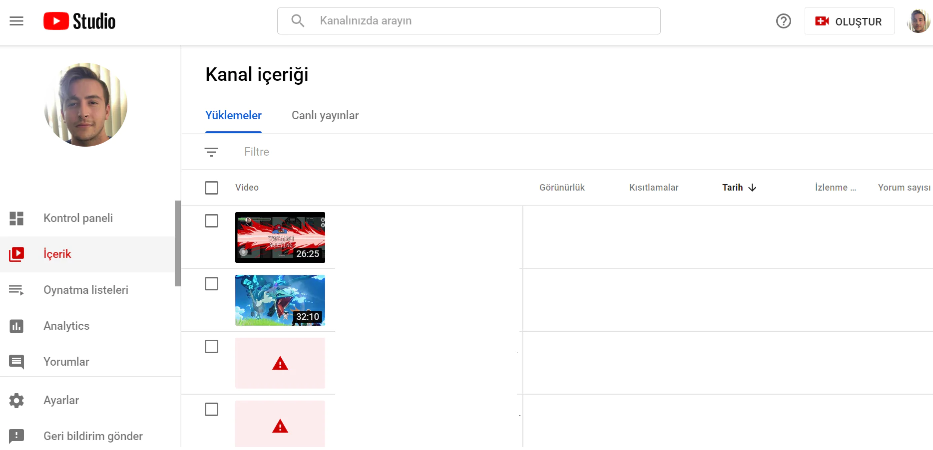 4.Açılan ekranda sol tarafta gözüken menü içerisinden ‘içerikler‘ sekmesine tıklayalım , eğer işlemi mobil cihaz üzerinden yapacaksanız ‘videolar‘ seçeneğine tıklamanız gerekmekte.