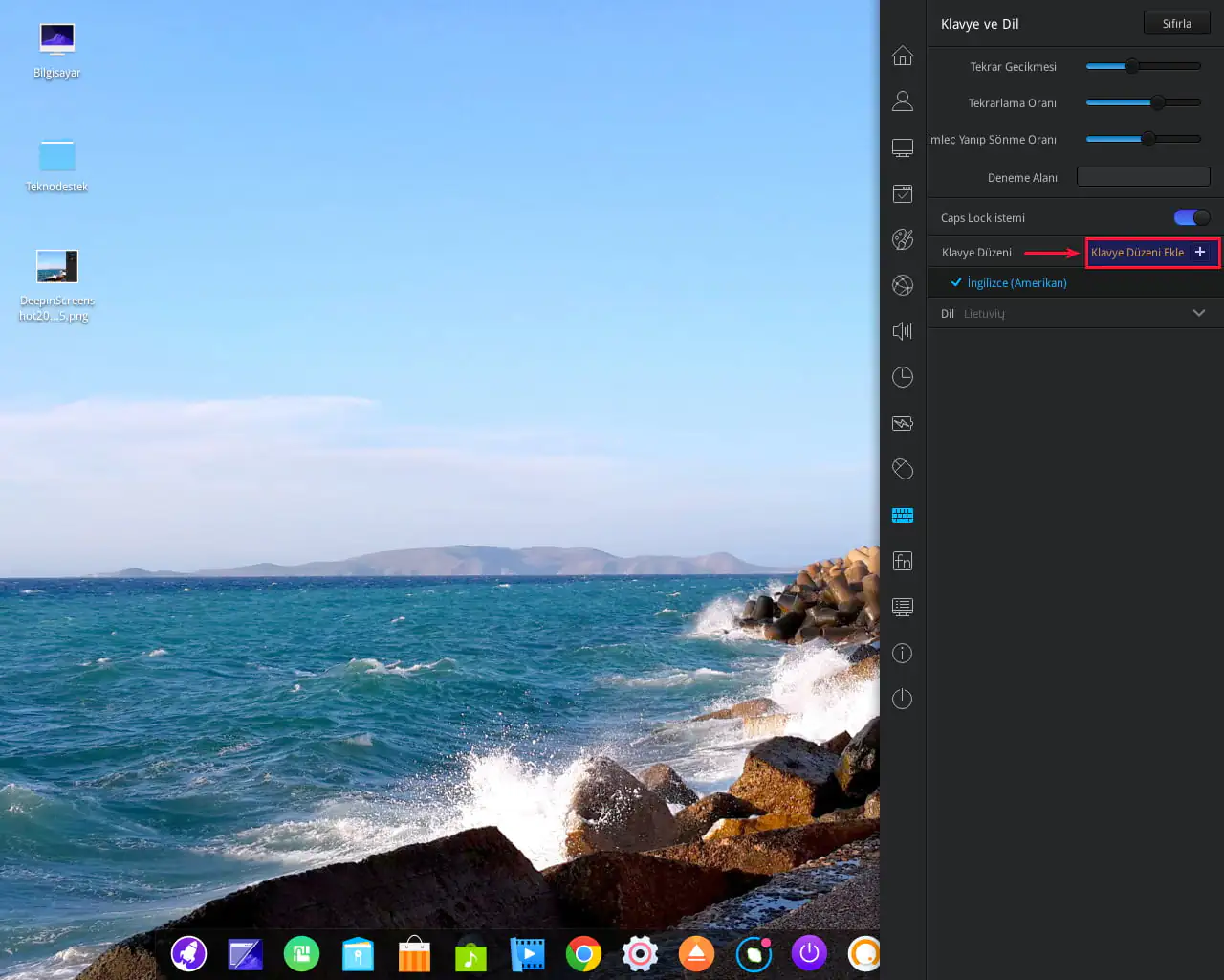 • Açılan pencerede klavye düzeni bulunuyor; hemen sağında artı (+) simgesi var, bu artı (+) simgesine tıkladığımızda ‘Klavye Düzeni Ekle’ bölümü açılıyor ve klavye dili İngilizce olarak görülmekte.
