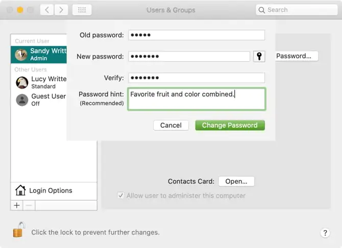 Bir şifre ipucu eklemek veya değiştirmek için soldaki bir kullanıcıya tıklayın ve Şifre’yi seçin. Ardından, Parolayı Değiştir düğmesine basın. Eski şifrenizi yenisiyle birlikte girin ve onaylayın. Ardından en alttaki parola ipucunuzu ekleyin ve Parolayı Değiştir’i tıklayın.