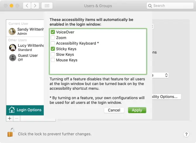 Giriş ekranı ayarlarının çoğu Sistem Tercihlerinizde bulunur. Bu ayarlar, otomatik oturum açmayı etkinleştirmek, bir kullanıcı listesini görüntülemek, kontrol düğmelerini göstermek, VoiceOver’ı açmak ve diğer işlemler için ince ayarlar yapmanızı sağlar.