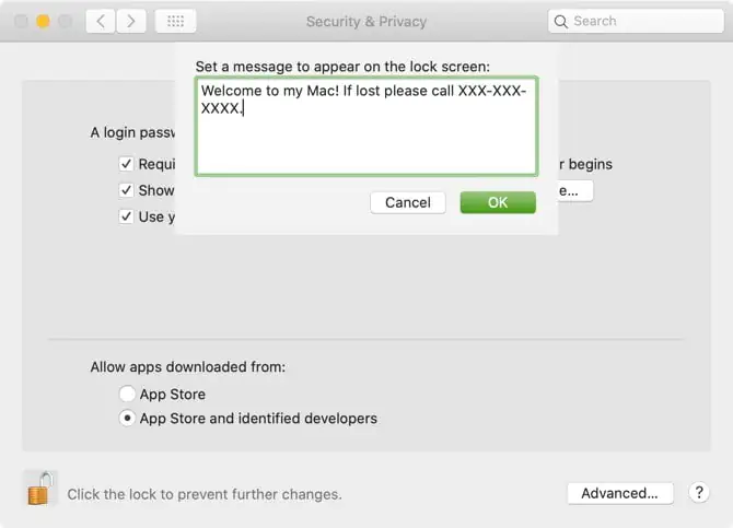 Giriş ekranınıza bir mesaj eklemek için, menü çubuğundan Apple menüsü> Sistem Tercihleri’ni tıklayın ve Güvenlik ve Gizlilik’i seçin.