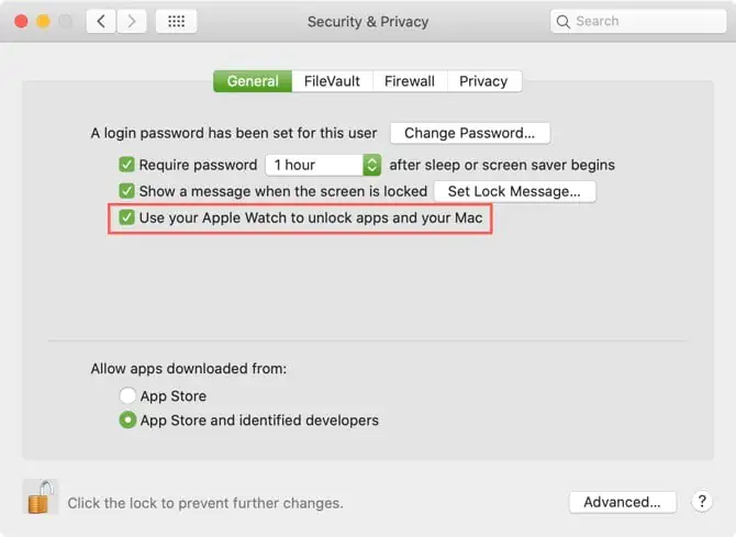 Uygulamaların ve Mac’inizin kilidini açmak için Apple Watch’unuzu kullanın kutusunu işaretleyin. (Apple Watch’unuz watchOS 3, 4 veya 5 kullanıyorsa, kutuda Mac’inizin kilidini açmak için Apple Watch’unuzu kullanın etiketi bulunur.)