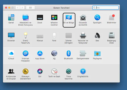 Mac’inizde sol üst köşede yer alan Elma logosuna tıklayoruz. Gelen menüde Sistem Tercihleri’ni seçiyoruz. Karşınıza gelen ekranda Dil ve Bölge’yi tıklayalım.