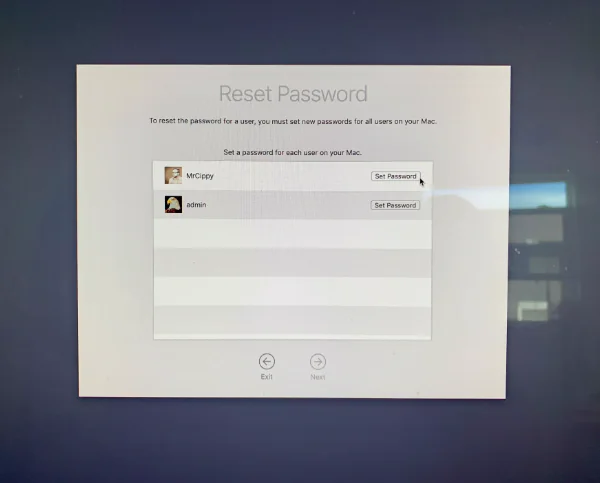 Parola Sıfırlama aracını bulacağınız Terminal penceresini kapatın. Mac’inizdeki tüm kullanıcı hesaplarının bir listesi görünecektir. Hesabınızın şifresini sıfırlamak için tüm kullanıcılar için yeni bir şifre belirlemeniz gerekir. Mac’inizi paylaşan herkes için yeni şifreyi yazdığınızdan emin olun.