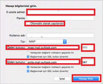 - Gelen sunucu = imap-mail.outlook.com