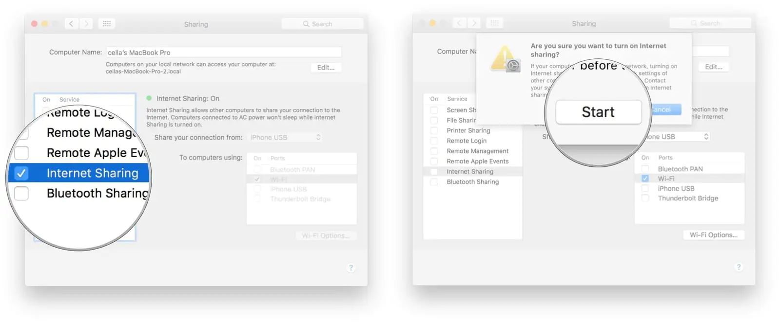 - Son olarak, Paylaşımı (Internet Sharing)’nı başlatmak için açılan pop-up (açılır) penceresinde ‘Başlat (Start)’ butonuna tıklayın.