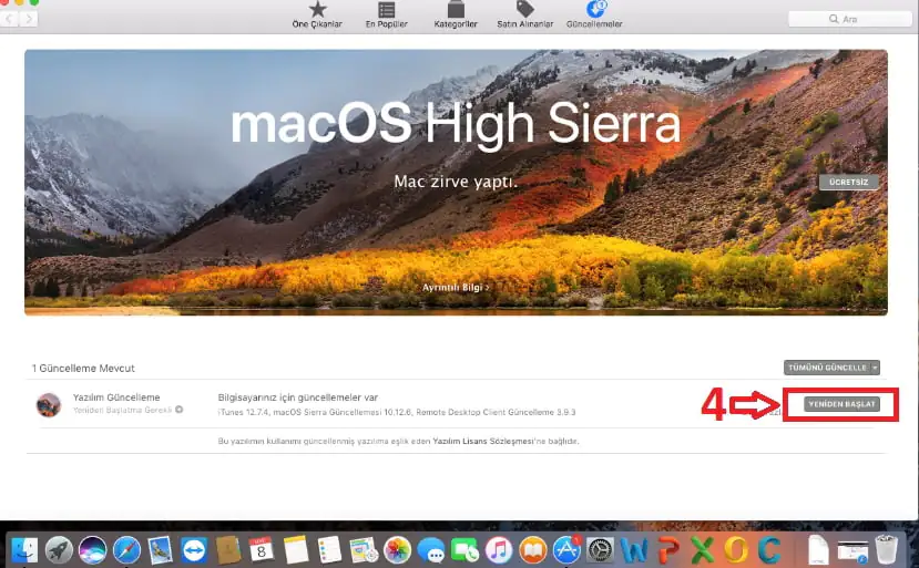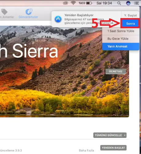 - Bir sonraki ekranda ise Mac’imiz, yayımlanmış olan tüm güncelleştirmeleri tarıyor ve sistemimize uygun bir güncelleme var ise bizlere sunuyor. Sistemimizi yeniden başlatarak ilgili güncellemeyi başlatabiliyoruz; ya da üzerinde çalıştığımız açık dosyalar var ise, güncelleme işlemini, duruma göre, 24 saat sonra tekrar hatırlatacak şekilde erteleyebiliyoruz.