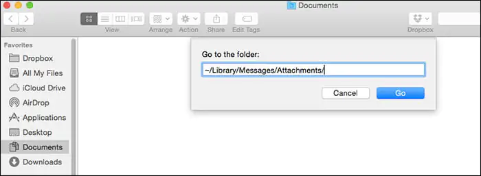 - Şimdi, açılan iletişim kutusuna ~/Library/Mesajlar/Ekler/ veya ~/Library/Messages/Attachments/ girin (yazın) ve Git (Go) butonuna tıklayın.