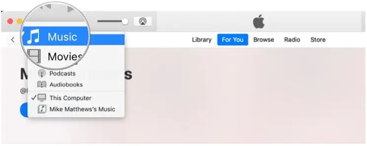 - iTunes’te medya türü (tipi) menüsünden ‘Müzik (Music)’ seçeneğini seçin.