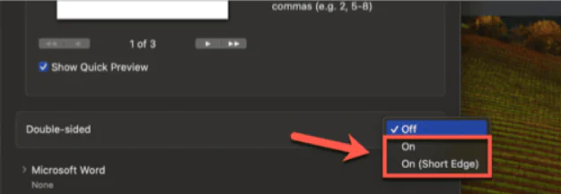 - Çift taraflı açılır menüsüne tıklayın ve Açık veya Açık (Kısa Kenar) öğesini seçin.