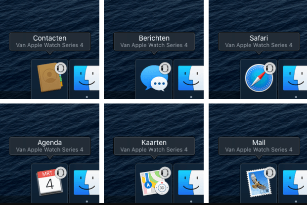 -iOS, iPadOS aygıtından veya Apple Watch’tan Mac’inize: iPhone’unuzda, iPad’inizde, iPod touch’ınızda veya Apple Watch’unuzda kullandığınız uygulamanın Handoff simgesi, Mac’inizde Dock’un sağ ucunda veya Dock’un konumuna bağlı olarak en altta yer almaktadır. Uygulamada çalışmayı sürdürmek için simgeyi tıklamanız yeterlidir.