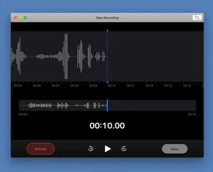 - Ses kaydı bittiyse, Bitti (Done) butonuna tıklayın; ardından, ses kaydı dosyasını bir isim vermek Yeni Kayıt (New Record) menüsüne tıklayın.