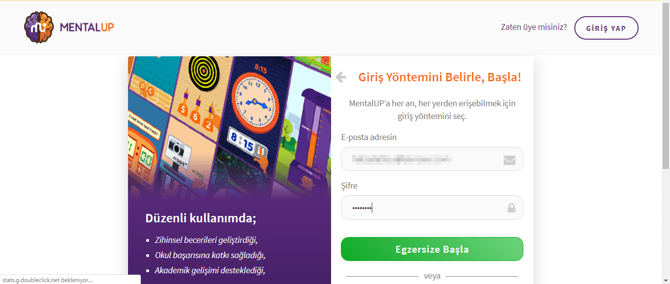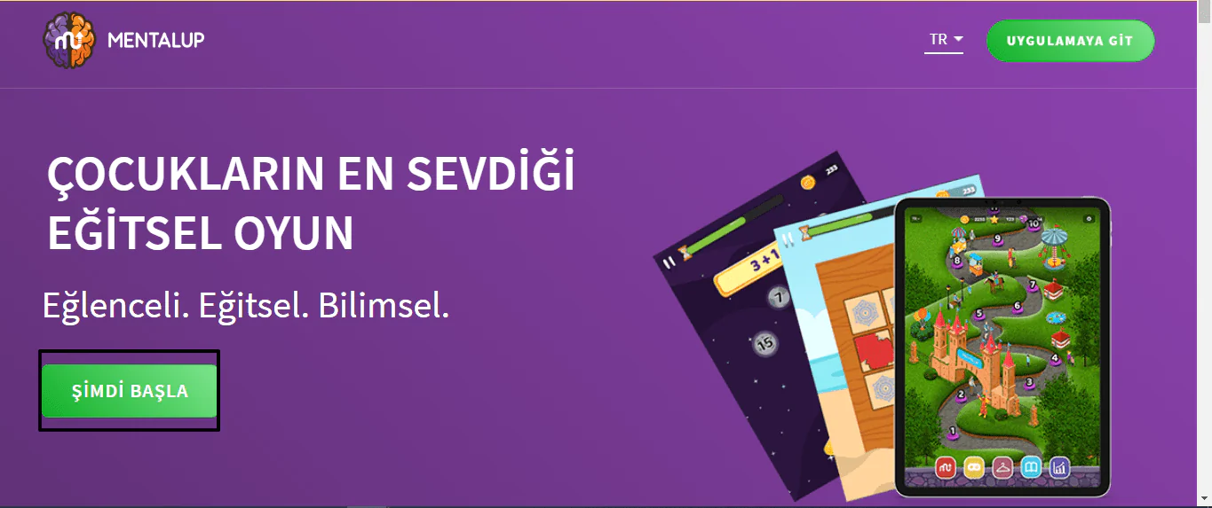 Bilgisayardan tarayıcınızdan( Google,Mozilla,Edge vb.) https://www.mentalup.net/ adresine giriş yapın. Gelen sayfanın alt tarafından şimdi başla seçeneğine tıklayın.