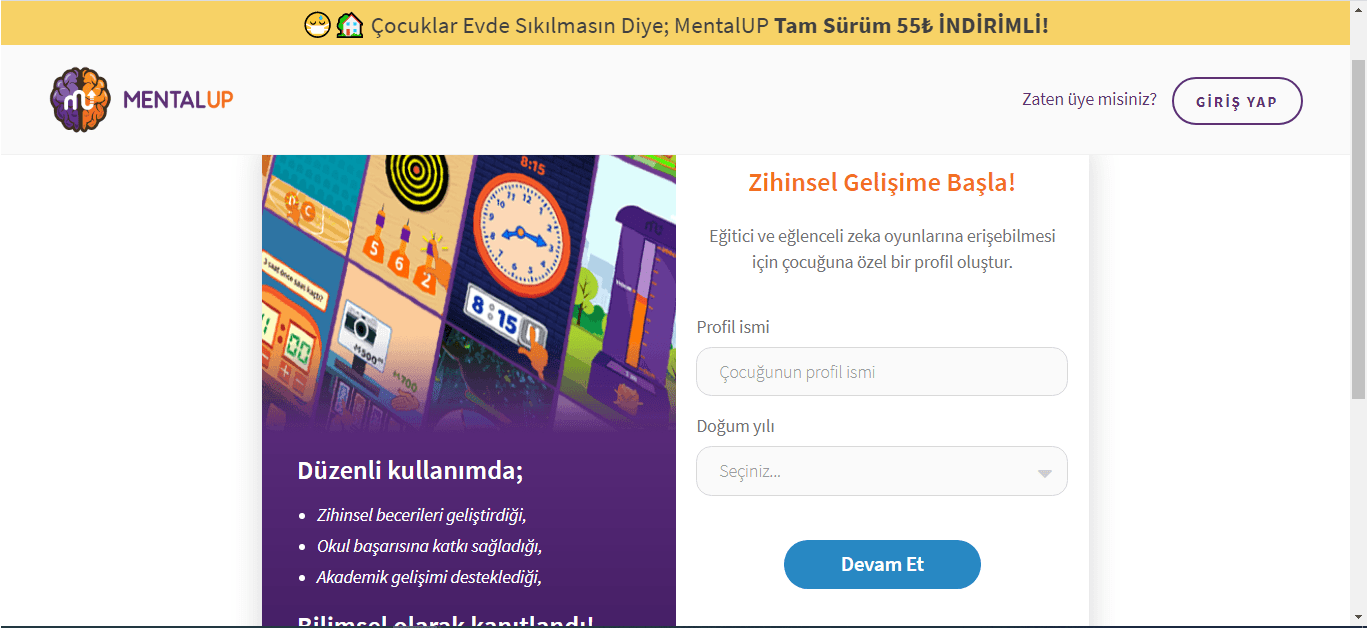 Karışımıza üyelik oluşturmak için bilgilerimizle giriş yapacağımız sayfa gelir. Burada profil için isim ve çocuğumuzun doğum yılını yazıp devam butonuna tıklayın.