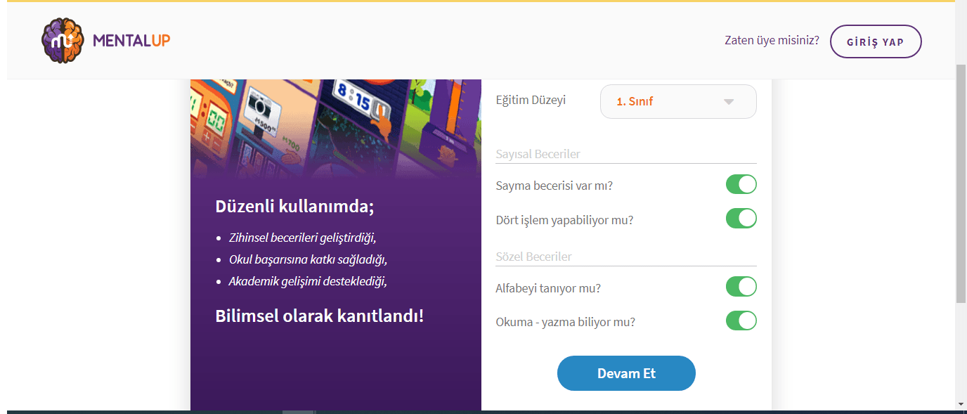 Sonraki aşamada ise çocuğunuzun eğitim düzeyi ve temel becerilerini belirleyin. Belirlediğimiz kriterlere göre oyunlar sistemden otomatik olarak belirlenir. Böylelikle her yaş grubu yaşına uygun etkinliklerden yararlanır. Yine devam et butonuna tıklayın.