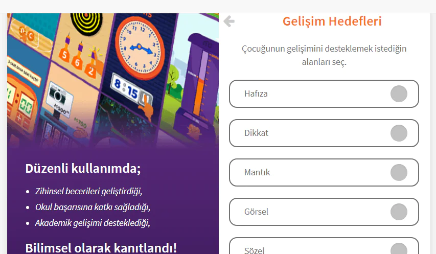 Tercihlerimizi belirleyip bir sonraki aşamaya geçtiğimizde çocuğumuzun gelişim için hedefleri seçme imkanı sağlamaktadır. Bu sayede özellikle gelişmesini istediğiniz alanları seçebilmektesiniz. Bunlar hafıza, görsel, mantık, dikkat, sözel gibi alanlar ve seçimize göre oyunlarla devam edebiliyorsunuz.