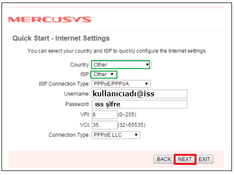 ISS’ye gidin ve İLERİ’ye tıklayın. Burada örneğin PPPoE / PPPoA modunu alıyoruz.