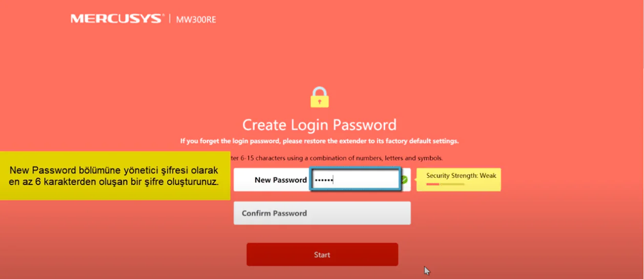 bu kısımdaki şifre boşluklarına en az 6 karaterden oluşcak şekilde kendimize göre bir parola oluşturalım daha sonrasında start butonuna basalım