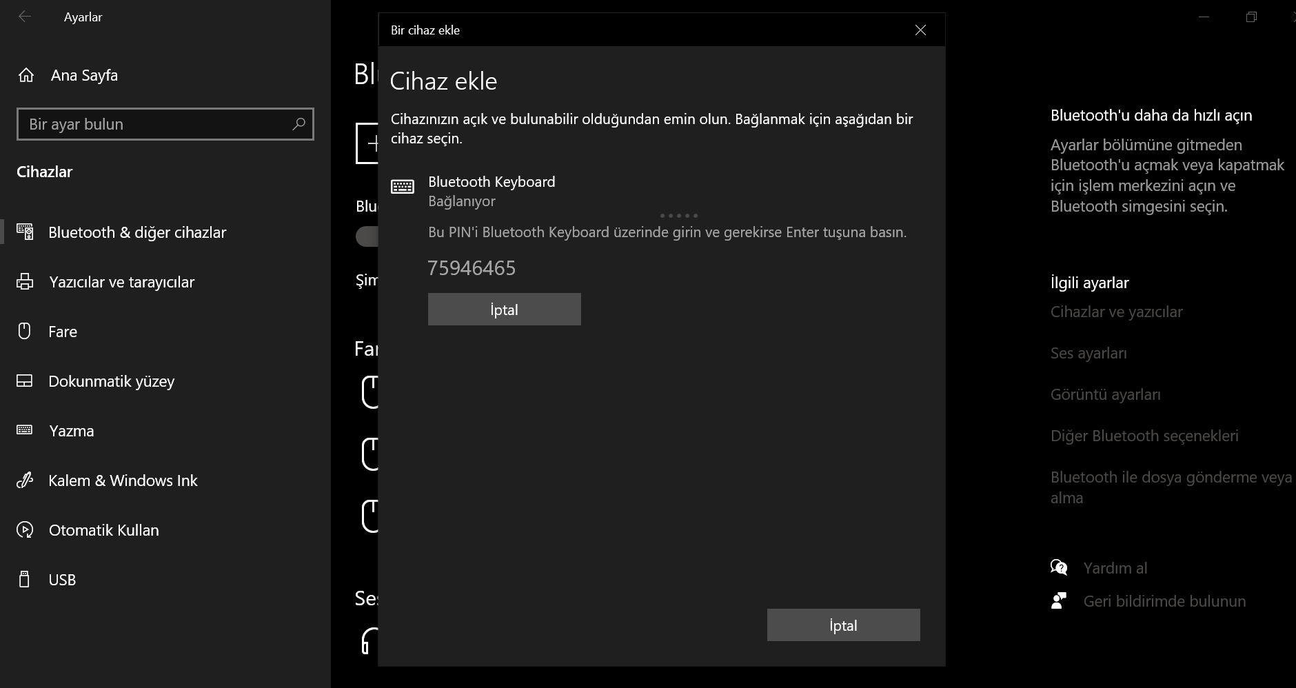 • Bluetooth Klavye seçeneğine tıkladıktan sonra Bilgisayar ekranınızda bir kod belirecek , Bu kodu ‘Bluetooth Klavyenizin’ üzerinde bulunan rakamlara tıklayarak yazıp ‘Enter’a basıp kurulumu tamamlıyoruz.