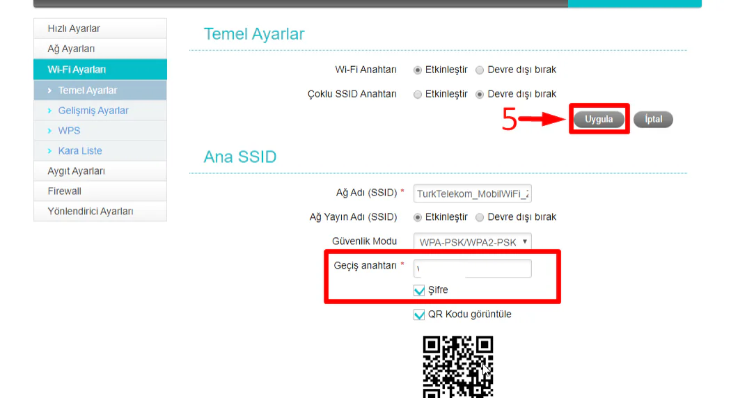 Sonrasında ise açılan ekranlarda bulunan Wi-Fi Ayarları kısmında bulunan Geçiş Anahtarı kısmında bulunan şifreyi silerek modemimize vermek istediğimiz şifreyi giriyoruz ve Uygula butonuna basıyoruz.