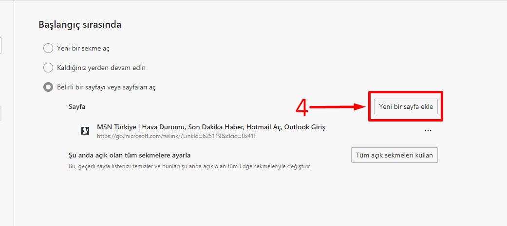 Bir sonraki ekranda ise karşımıza gelen bölümde Sayfa alanındaki Yeni bir sayfa ekle butonuna basarak tarayıcımızın açılış ekranında bizi karşılayacak internet sitesinin url’sini sisteme kodluyoruz.