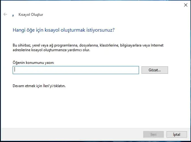 Kısayol oluşturma penceresinde konum satırına aşağıdaki komutu yapıştırmamız yeterli olacaktır.