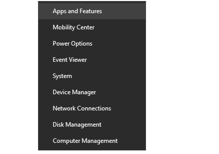 - Başlat düğmesini sağ tıklayın Windows 8 ve Windows 10’da (sol alt köşe) Windows Başlat düğmesi ve açılır menüden Uygulamalar ve Özellikler’i seçin