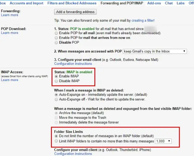 IMAP Erişimi bölümünde, IMAP’yi Etkinleştir geçişini etkinleştirin. Yoğun bir e-posta adresiniz varsa, Klasör Boyutu Sınırları kontrolünü kullanmak isteyebilirsiniz. Bu, belirli bir miktarda iletiden daha az olan klasörlerle senkronizasyonu kısıtlamanıza olanak tanır.