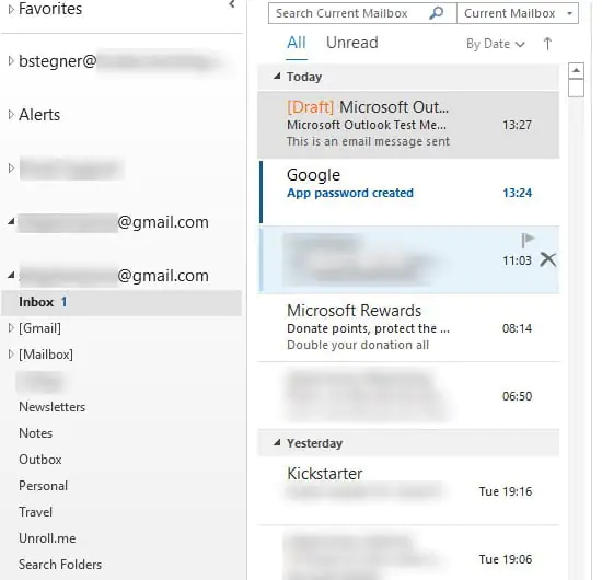 Yukarıdakileri yaptıktan sonra, tümü Outlook’ta Gmail’e erişmeye hazırsınız. Outlook’ta başka hesaplarınız varsa, sol kenar çubuğundaki sekmeleri kullanarak bunlar arasında geçiş yapabilirsiniz. Bu hesabı genişletmek ve tüm klasörlerini göstermek için bir oku tıklayın.