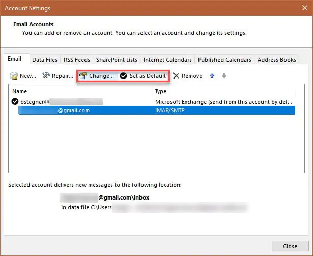 Gmail hesabınızı çoğu zaman Outlook’ta kullanmayı planlıyorsanız, varsayılan olarak ayarlamak mantıklı olur. Outlook’ta, Dosya> Bilgi> Hesap Ayarları’na gidin ve açılır kutuda Hesap Ayarları’nı tıklayın. E-posta sekmesinde, Gmail adresinizi tıklayın ve Varsayılan olarak Ayarla’yı seçin. Outlook bundan sonra varsayılan olarak açılacaktır.