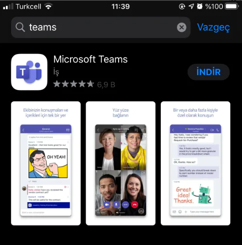 İlk olarak mobil cihazınızın uygulama mağazasına (app store, play store) girip arama kısmına Microsoft Teams yazıp aratalım. Ve çıkan sonuçlardan indirelim.