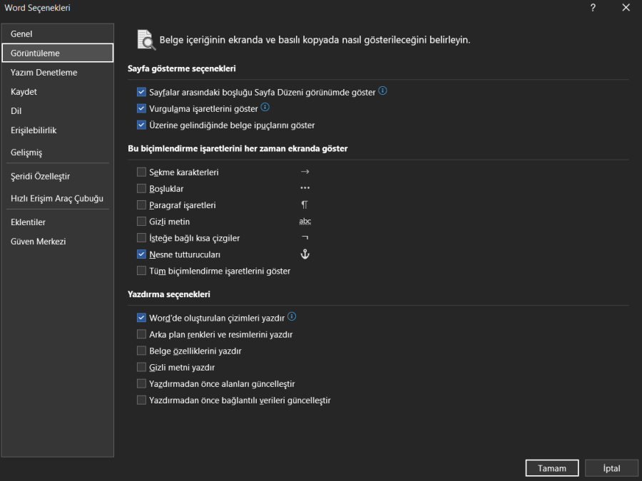 - Yazdırma Düzeni Görünümünde Sayfalar Arasında Beyaz Boşluk Göster seçeneğinin işaretini kaldırın.