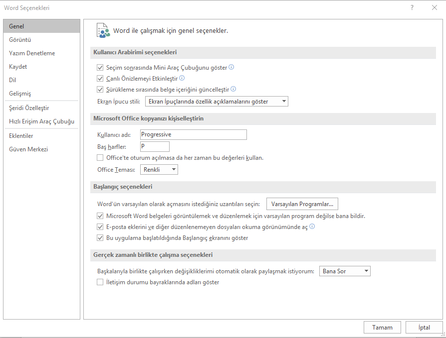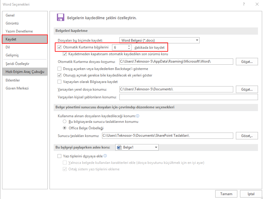Açılan sayfada yazım denetleme, dil vs. gibi ayarlar da bulunuyor. Biz sol tarafta bulunan Kaydet menüsüne tıklıyoruz. Açılan yeni pencerede “Otomatik Kurtarma bilgilerini” yazan kısmın karşısındaki kutucuğa kaç dakikada bir kaydedilmesini istiyorsanız, belirleyeceğiniz dakika aralıklarında otomatik kaydetme işlemi sağlanacak; böylece doğabilecek sorunlara önceden tedbirimizi almış oluyoruz.