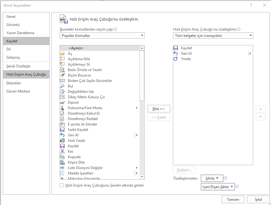 Bunun dışında sol tarafta yine Hızlı Erişim Araç Çubuğu sekmesi bulunuyor. Bu menüden de Word sayfasında hızlıca erişmek istediğimiz, yapmak istediğimiz işlemler için se çenekler bulunuyor. Bu seçenekler sayesinde de daha hızlı işlem sağlayabiliriz; eklemek istediğimiz kısa yolu seçip Ekle butonuna tıklıyoruz ya da kaldırmak istersek, sağ tarafta bulunan seçeneklerden seçip Kaldır butonuna tıklamamız yeterli oluyor.